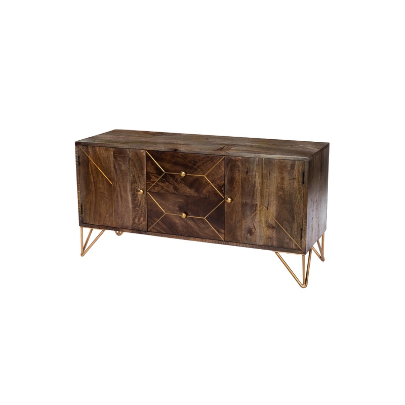 The minimalist design meets intricate patterned wood adorned by brass inlays are reflective in this entertainment console. The soft wood tones will fit most anywhere in your home; while adding storage opprtunities for all your tv or entertaining needs. The simplistic hairpin bent legs add the bit of detail to draw your attentions upon adorned in gold metal finish. Whether placing family treasures or family favorites upon this console, it will be eye catching for all to see.