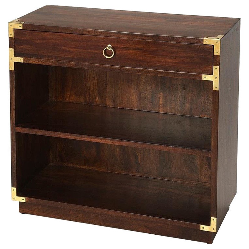Add simple sophistication and essential storage space to any room in your home with this lovely bookcase. The wood construction, wood grain details, as well as the gold hardware give this book shelf a campaign look, while the two open shelves and drawer, p