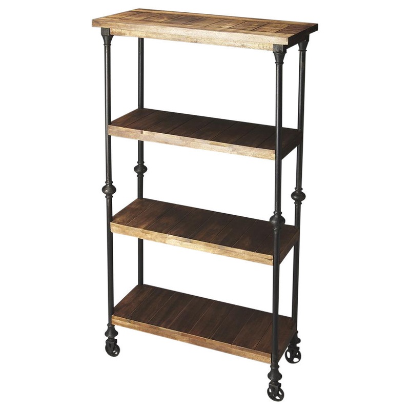 Crafted from iron finished in an epoxy gray and solid-wood planks, this unconventional Bookcase on wheels provides a compelling showcase for large books and tall decorative accessories. Features: -Finish: Multicolor -Material: Mango Wood Solids, Iron -Shap