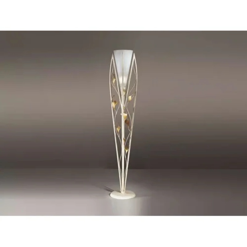 This floor lamp has a classic design, with which it is able to transmit lightness and create a relaxing and comfortable environment. Made of hand-decorated glass, trapped by wrought iron wings and decorated with gold leaf, which create a magnificent effect, this floor lamp fits well in a classic style environment and will be able to surprise even the most critical eye.