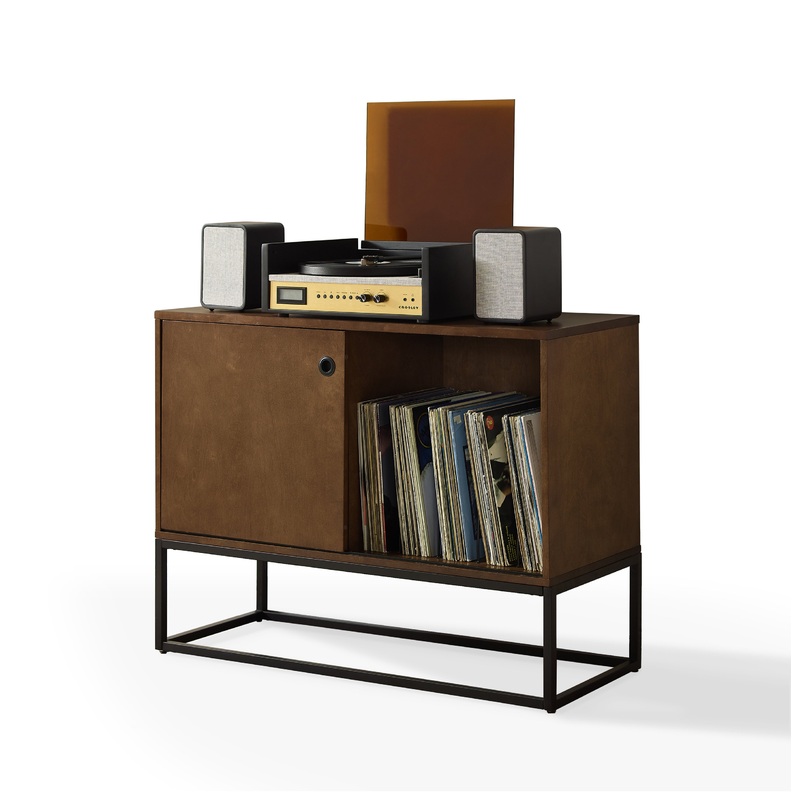 The Byron Media Console provides storage while also showcasing your treasured vinyl. Featuring a modern, streamlined look, this console has a single sliding door with a flush door pull and a sleek metal frame base. The single sliding door opens to an adjus