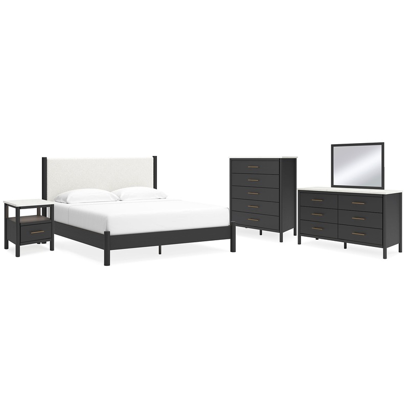 Cadmori King Upholstered Panel Bed with Mirrored Dresser, Chest and Nightstand