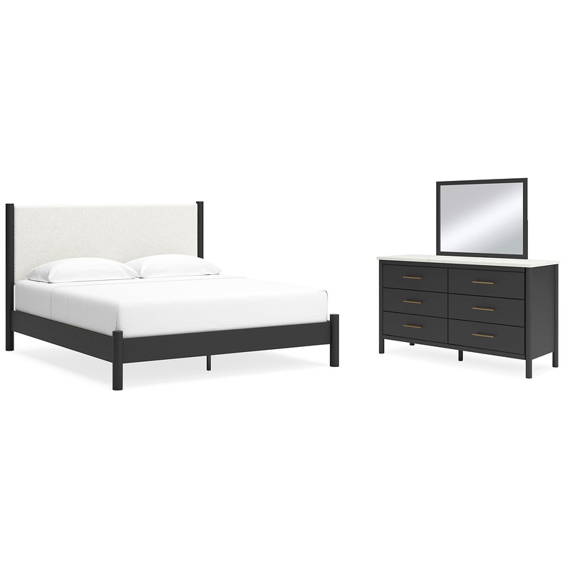 Cadmori King Upholstered Panel Bed with Mirrored Dresser