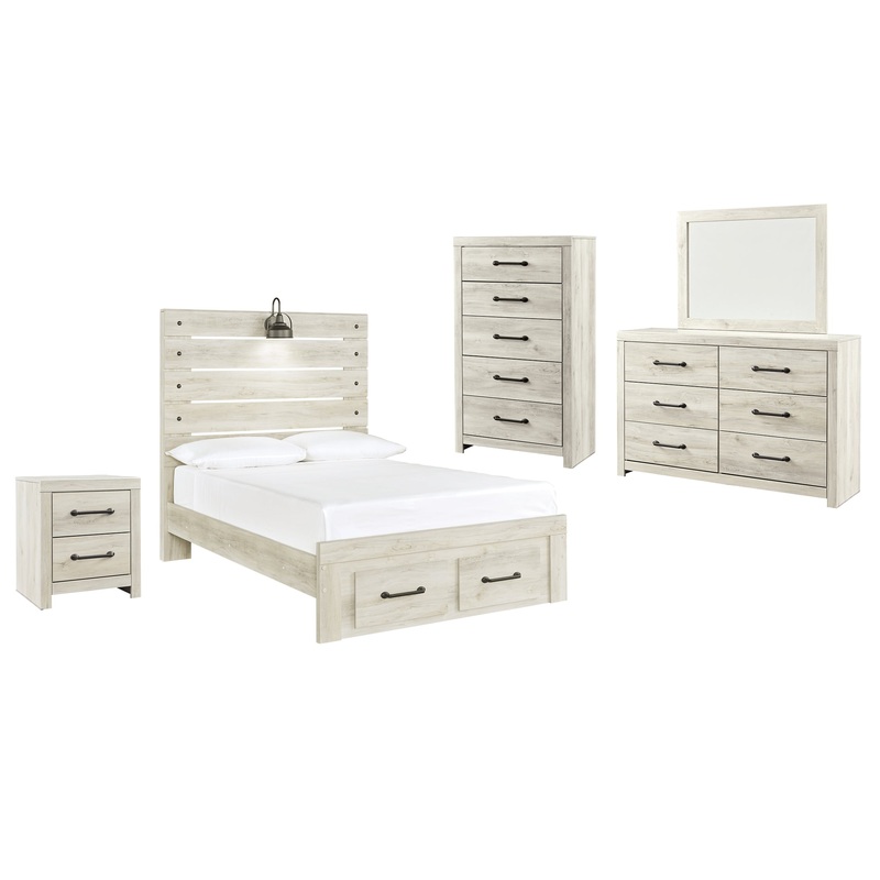 Whether you lean towards modern loft or modern farmhouse, this panel storage bed, nightstand, chest of drawers and dresser with mirror tip the balance in your favor. The wispy whitewash finish enhances the style without covering the grain for that weathered look you just cant get enough of. Love to read in bed? Youre sure to find the retro-chic light sconce and USB plug-ins on the open-slat style headboard to be a totally bright idea, while the elongated metal drawer pulls really elevate the aesthetic. What a delightful take on rustic industrial style.