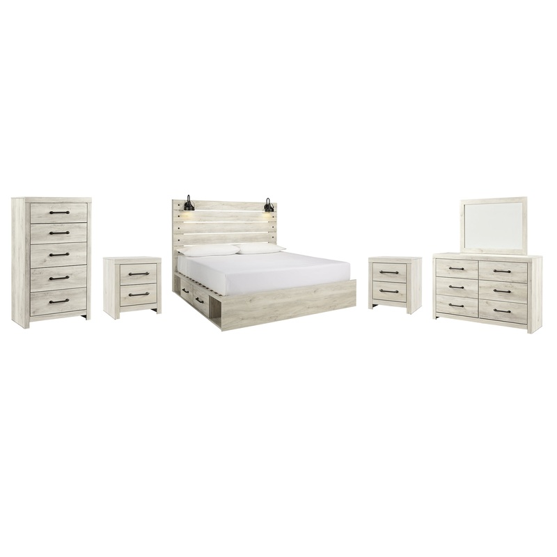 Whether you lean towards modern loft or modern farmhouse, this panel storage bed, two nightstands, chest of drawers and dresser with mirror tip the balance in your favor. The wispy whitewash finish enhances the style without covering the grain for that wea