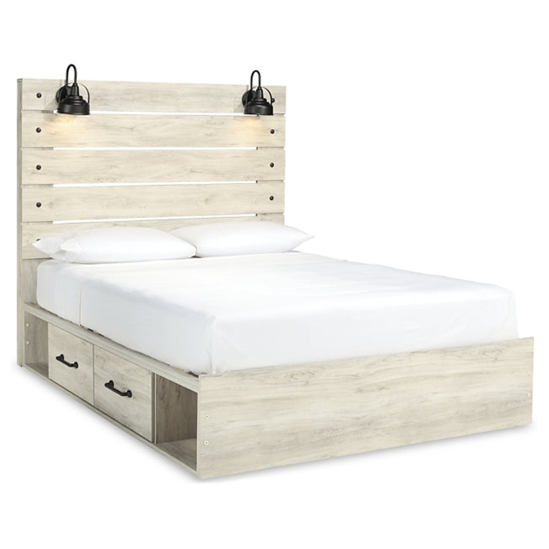 What a delightful take on rustic industrial style. Whether modern loft or modern farmhouse, this queen panel storage bed makes itself at home. The wispy whitewash palette enhances without covering the grain for that weathered look you crave. Love to read in bed? Youre sure to find the retro-chic light sconces and USB plug-ins on the open-slat style headboard such a bright idea. Elongated drawer pulls on the under bed storage drawers elevate the aesthetic.