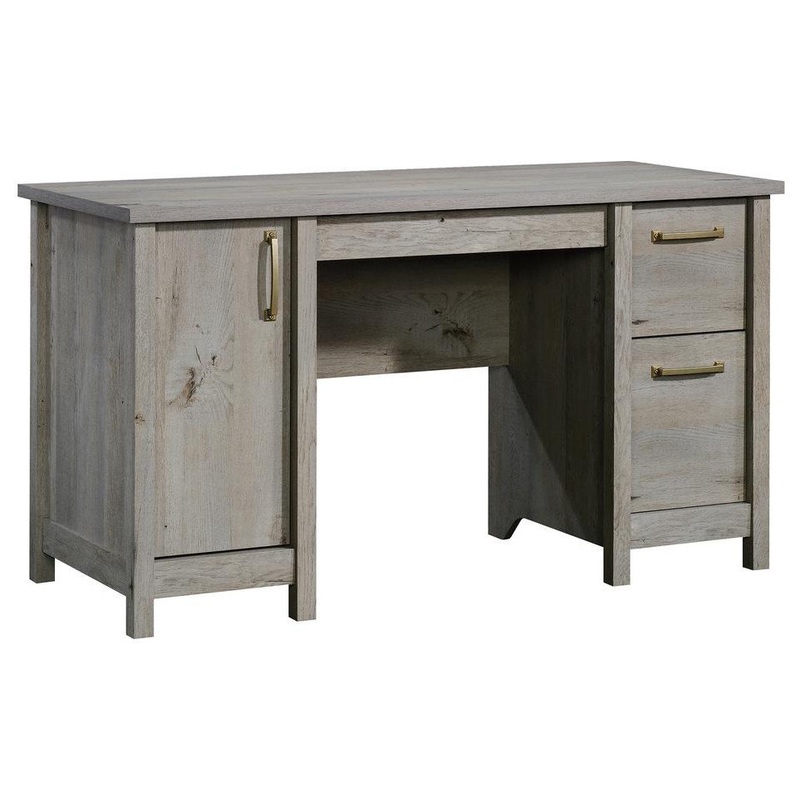 Could your home office or workspace use a little TLC? Give it a fresh, new update with the sleek style of this computer desk from the Cannery Bridge collection. Its spacious top surface provides you with ample room for all your must-have desk essentials like your laptop, a notepad or two, a cup full of pens and even a stylish accent lamp. It features a pencil drawer and a small storage drawer that opens and closes on smooth metal runners for easy access storage of items like rubber bands, scissors, stapler and much more! It also features a lower drawer that holds letter-size hanging files so you can keep all your important documents organized. Behind the door is a hidden storage area that includes an adjustable shelf and can also accommodate a vertical CPU tower. Finished on all sides in Mystic Oak and detailed with attractive hardware, this good-looking desk will have you feeling motivated and ready to work.