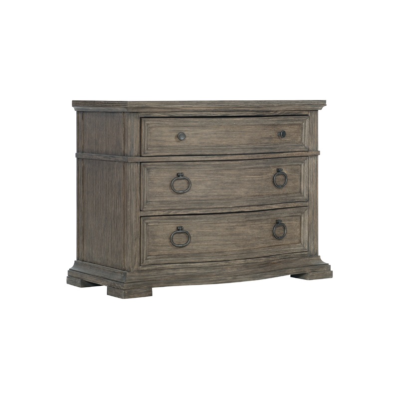 With a unique mix of materials and finishes, the Canyon Ridge bachelors chest gives a classic form a relaxed modern feel. Crafted from radiata pine solids with yellow pine veneers, it features a bowed front and three drawers accented by bead molding and distressed iron hardware. A wire-brushed Desert Taupe finish adds warmth to the pine veneers, enhancing depth and variations in the wood grain.