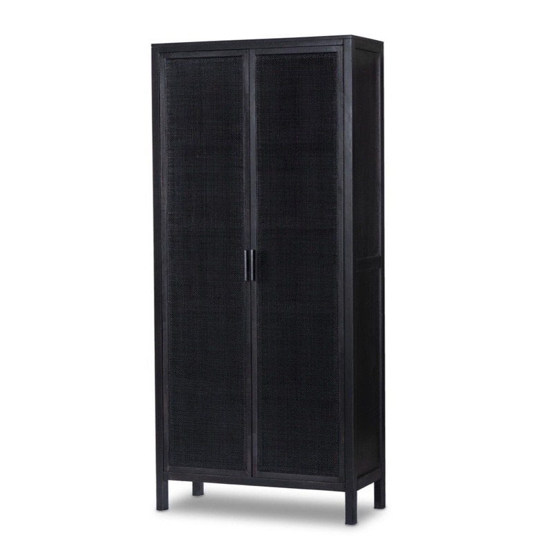 Talk about texture. Washed black mango forms spacious open shelving, with woven door fronts of natural cane for eye-catching contrast and a fashion-forward feel.