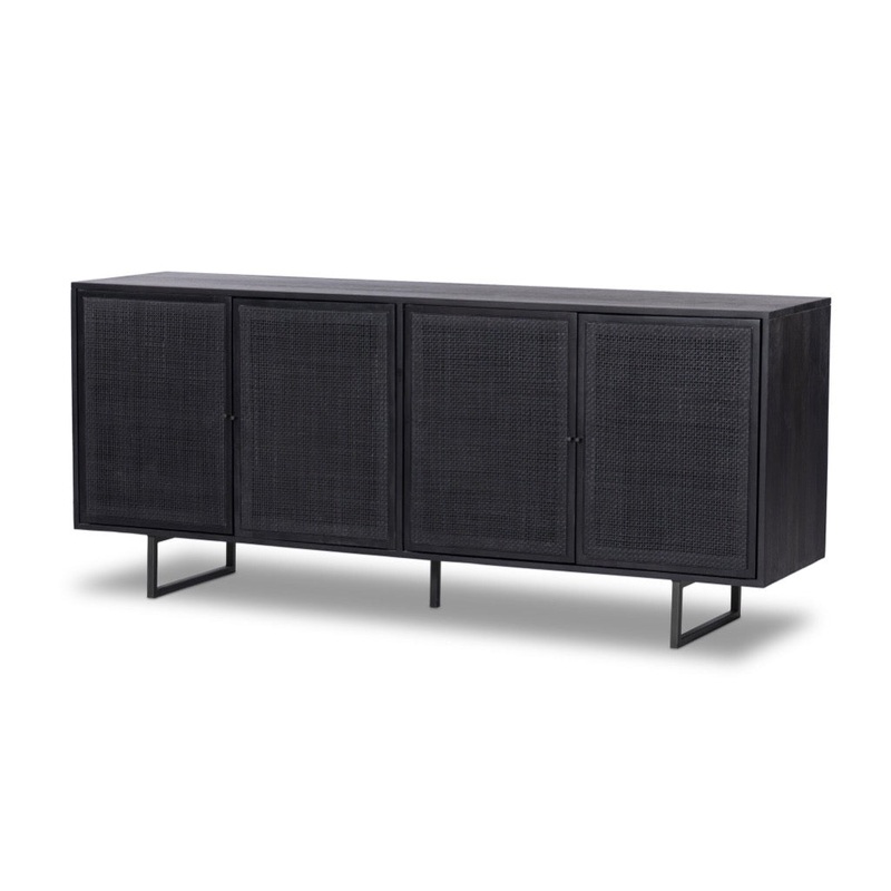 Mid-century-inspired style with an organic twist. Surrounded by mango casing, light cane weaves for a fresh look with natural depth. Angular gunmetal-finished iron legs offer an intriguing contrast of texture and tone.