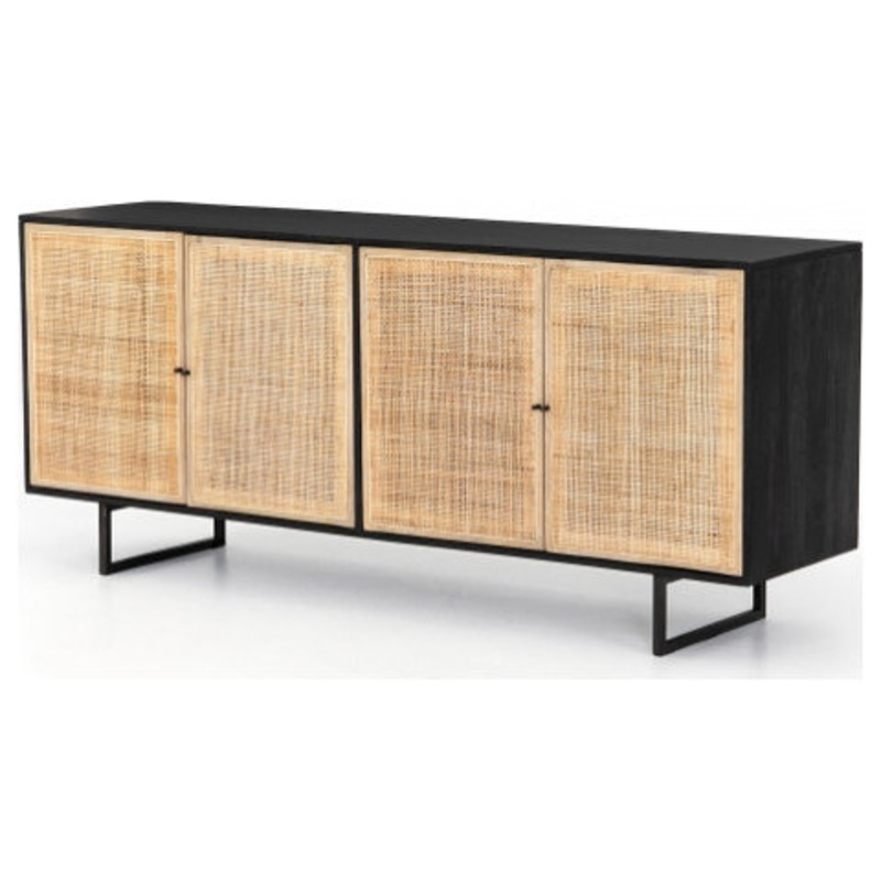 Mid-century-inspired style with an organic twist. Surrounded by black mango casing, light cane weaves for a fresh, high-contrast look with natural depth. Angular gunmetal-finished iron legs offer an intriguing contrast of texture and tone.