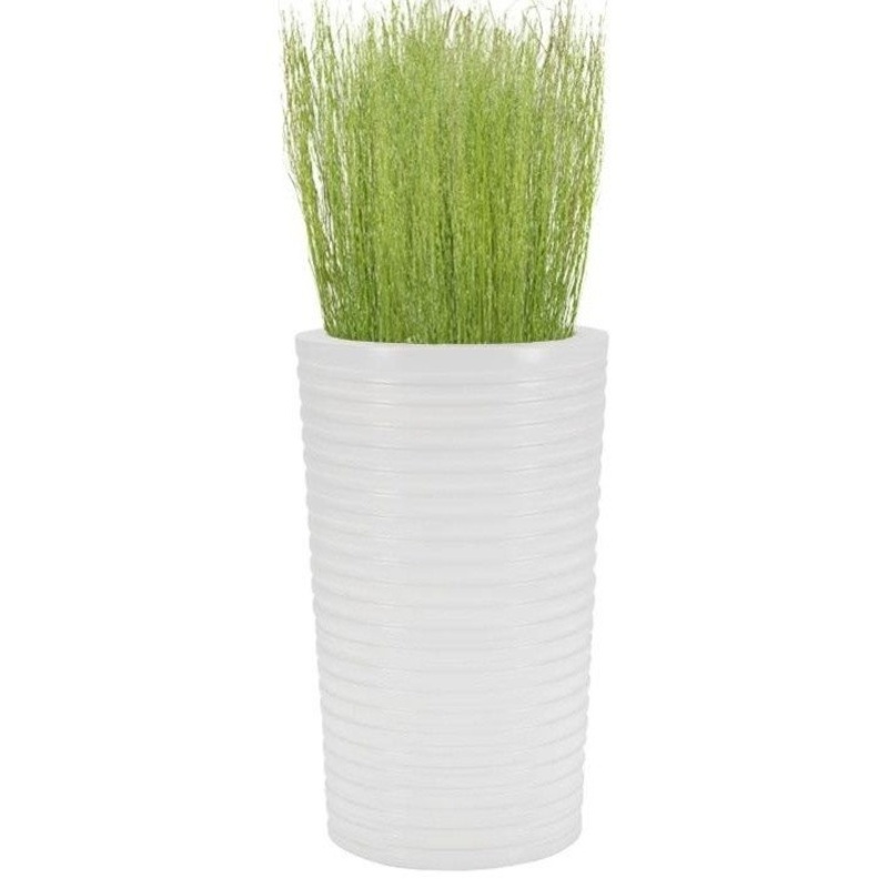 Svelte white fiberglass planter with ribbed pattern. Heavy duty – perfect for commercial and residential use. Includes drainage holes. UV-resistant. Matte white finish.