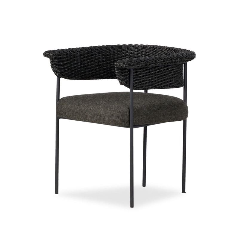 Airy and light with slim, black-finished iron framing and black upholstery that lends texture to a beautifully sculpted outdoor dining chair featuring a faux black hyacinth back and exterior fold detailing. Cover or store indoors during inclement weather and when not in use.