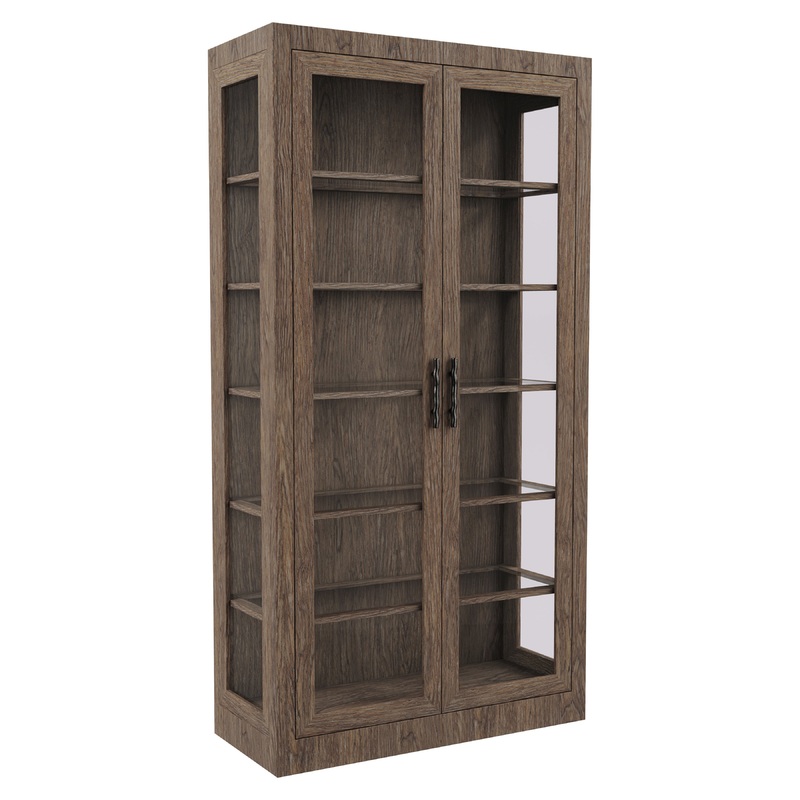 Two wood-framed doors and end panels in Playa finish, with inset tempered glassEnd panels have center mullionFive wood-framed tempered glass shelves with polished edges and wood bottom surfaceCenter shelf is fixed, while other four glass shelves are adjust