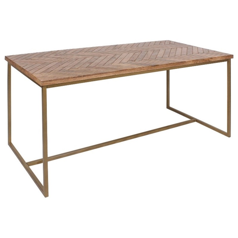This gorgeous one-of-a-kind handcrafted dining table is an elegant showpiece for your dining room. Its rectangular silhouette and rich warm tone with its herringbone pattern offer a unique visual appeal. The dull golden finish on the metal frame adds a glo