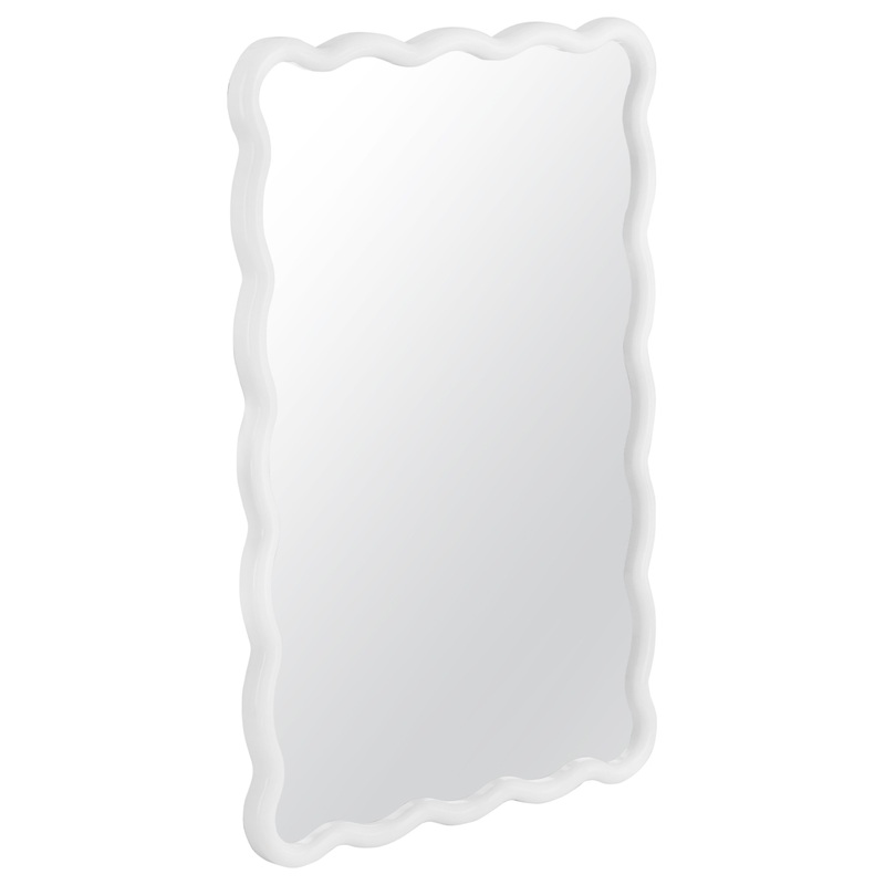 The Cassia Wall Mirror is an ideal accent to brighten your space, featuring a white lacquered mirror frame for a playful touch. Its wavy edges offer a fun twist on the traditional rectangular shape, adding personality to any room. This mirror effortlessly enhances your decor.