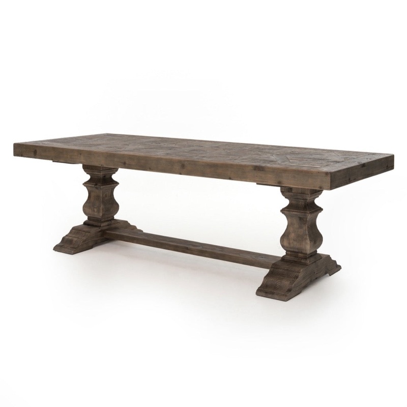 Beautiful from every angle, this traditional trestle table is imbued with extra special detailing. A thick, parquet top made from reclaimed, bleached pine is supported by a turned, two-pedestal base of solid fir.