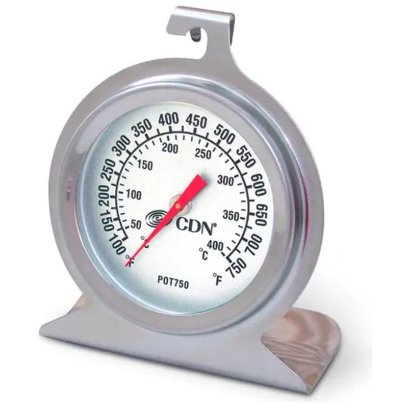 This CDN POT750 High Heat Oven Thermometer features a .75″ dial for easy reading. It’s 304 stainless steel housing and laboratory flass are heat resistant and ovenproof. Mountable by clipping to oven rack. Temperature range is 100 to 750F/50 to 400C. Stainless Steel Finish.