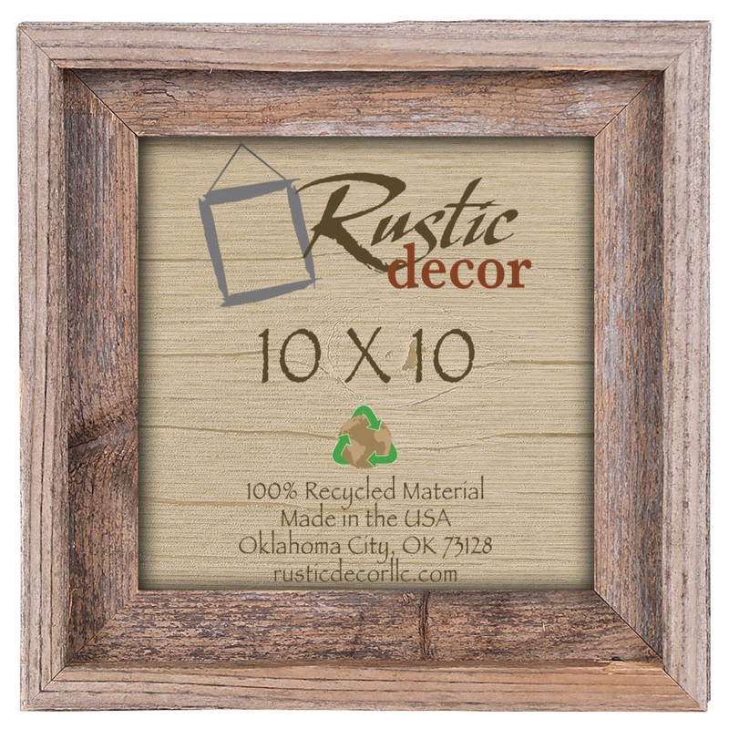 This 10-by-10 inch frame is manufactured from 100% authentic weathered barn wood allowing the rustic charm of the natural knots, nail holes and color variations to show through. This frame is natural in color and comes with plexiglass, back and hanger for wall hanging. All frames are custom-made at the time of order and will vary slightly from the picture due to the nature of the wood. Made in the USA.