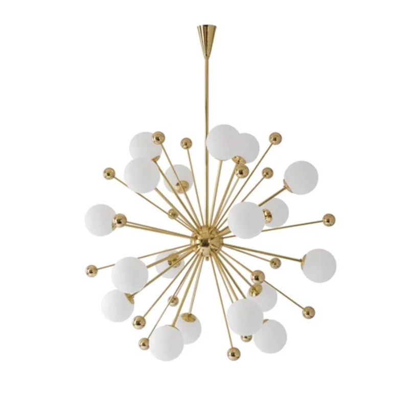 Soft lines contrasting with the generous shape: the result is a piece of lighting which would be the absolute protagonist of your living. The polished brass version acquires its own patina naturally; after 5-6 months it become a vintage Chandelier, which will bring you back in the 50s! The polished lacquered version, instead, is more brilliant and will mantain its original aspect in time.