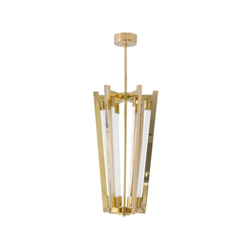 Taking its inspiration from the world of 1920s cabaret, this piece combines pure form with a tightly structured aesthetic through the use of high-value materials and traditional craft techniques. The polished brass version acquires its own patina naturally; after 5-6 months it become a vintage Chandelier, which will bring you back in the 50s! The polished lacquered version, instead, is more brilliant and will mantain its original aspect in time.