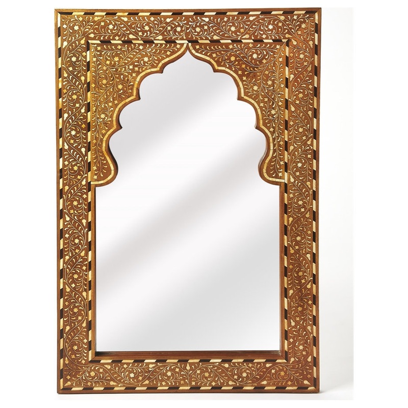This rectangular wall mirror is an extraordinary feat of craftsmanship. Its wondrous botanical design with a mihrab inset frame is painstakingly created inlaying bone within a merranti wood frame one individual piece at a time. Its hand rubbed finish will elegantly blend with virtually any style while imparting a touch of bohemian chic to a living room, hallway or entryway.