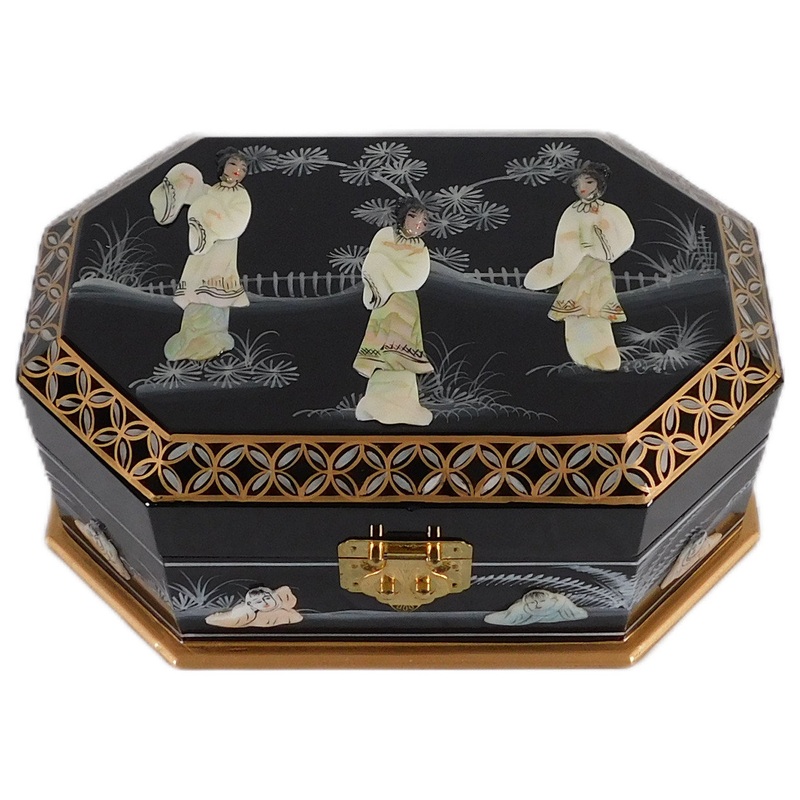 Our 12" wide Chinese black lacquer jewelry box is adorned with silk compartments, mother of pearl carved inlays and a traditional hand painted Chinese lady palace scene. The box lid and all inside compartments are felt lined and there are three jewelry org