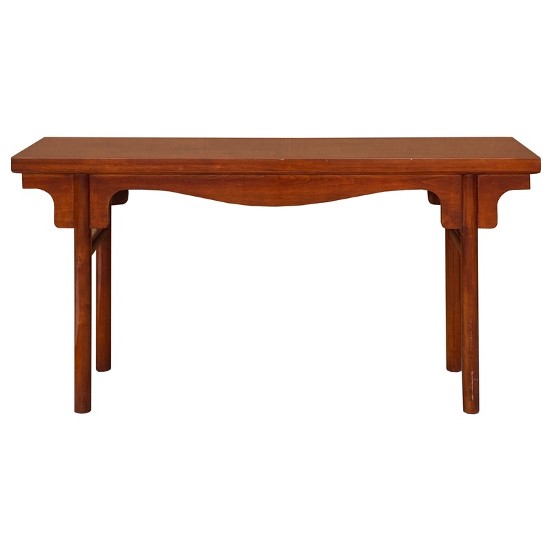 This is a handmade Chinese accent decorative altar table. It is made of natural hardwood, in a single plank which has beautiful light brown stain color and wood pattern. It has a dense texture for precise motif carving. But this piece has a clean elegant M
