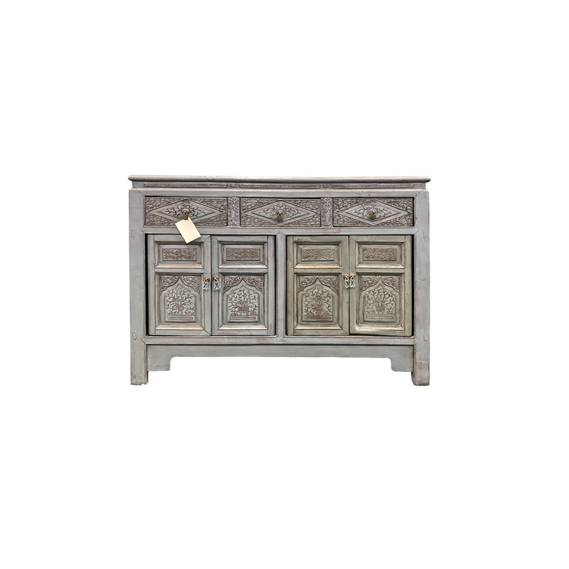 This is a console sideboard cabinet with oriental relief carving of flowers on the front apron. The surface is finished with rustic distressed gray color with marks. It is a charming piece as a sideboard, console, or buffet.