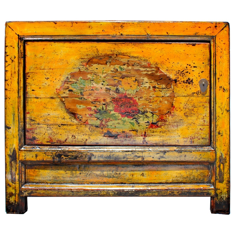 This is an old Gansu style cabinet with refinished surface color – distressed orange yellow mix lacquer with a hint of brown. The graphic is original with a touch-up. It is good as a TV stand or sideboard or console table.