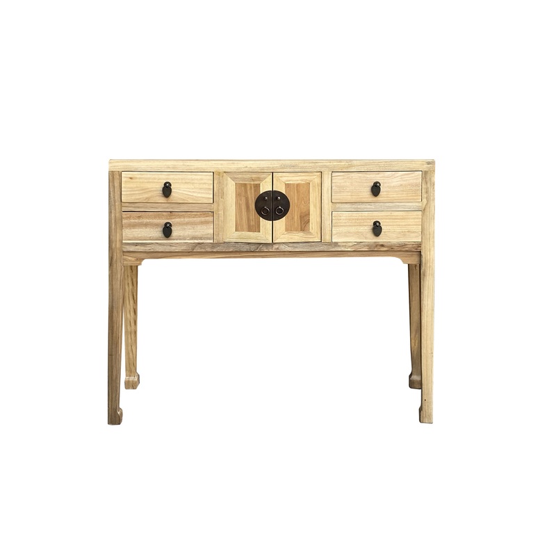 This is a simple tan natural wood color console side table with a straight leg design. Drawers are decorated with Asian style handles. -Dimensions: w37.5"x d10"x h34" ( underneath height 21.5" ) -Origin: China -Material: Wood -Condition: hand made, minor d