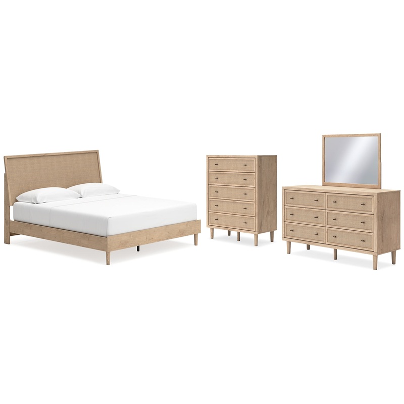 Clean-lined and contemporarybut far from starkthis bedroom package is a fresh style awakening. Pairing a light finish with replicated oak grain and textured beige details that replicate the look of cane, its mixed materials bring a naturally versatile vibe