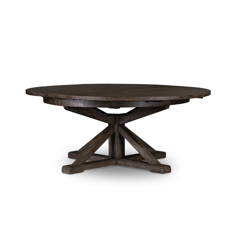 A welcoming, round farmhouse table draws the eye with its reclaimed wood top and a compelling architectural base in a rustic black olive finish. Easily extends to 79" with built-in leaf.