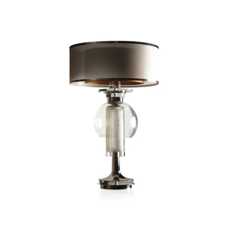 CL2107 Table LampThe designer Simone Granchi designs this collection of lamps produced by the Italian brand Sigma L2.Crystal lamp composed with nickel-plated brass and plexiglass. The double lampshade is in fabric outdside and woven silver and inside in am