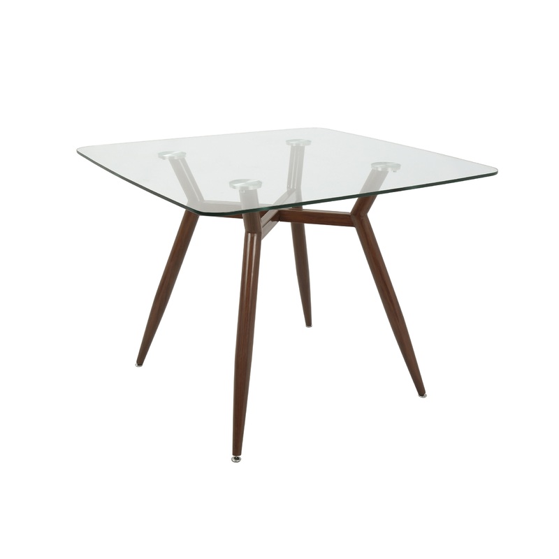 Simplistic and sleek, the Clara Dining Table features geometric metal legs under a clear tempered glass top or a walnut wood top. Available in two leg finishes, pair with the Clara Dining Chair for a complete look! -Mid-Century Modern styling -Fixed dining