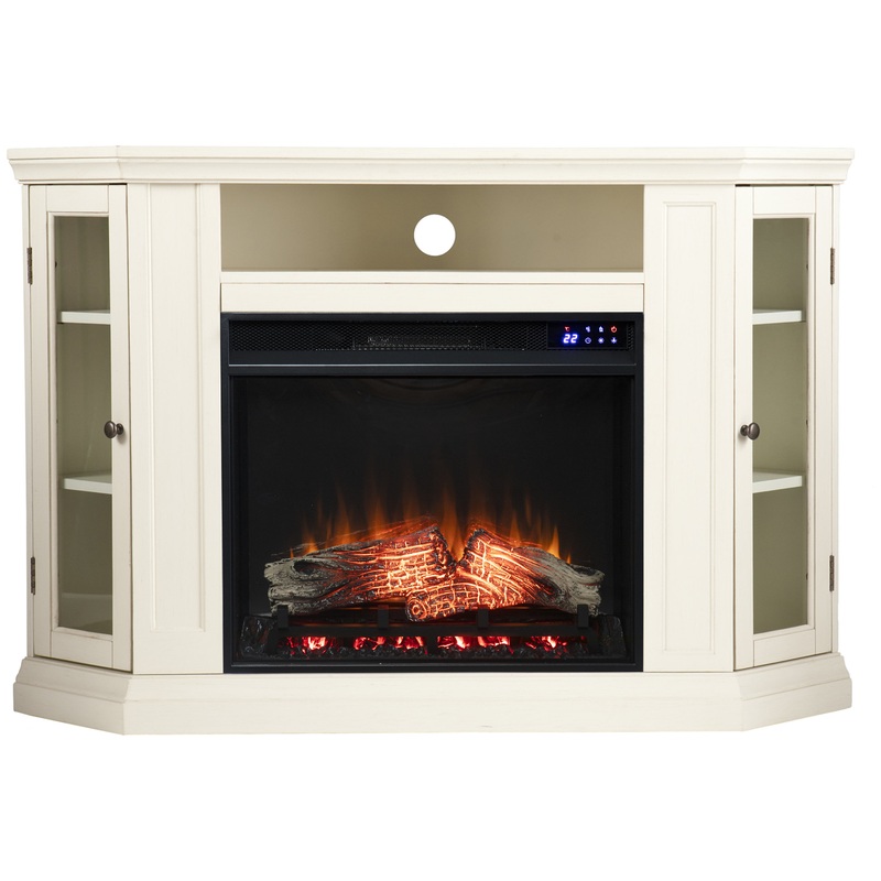 For entertainment enthusiasts, this ivory-finished fireplace tops the charts. Triangular media cabinets on either side of the firebox provide plenty of space for your favorite media selections, while the media shelf above offers convenient cord access. Realistic flames and embers keep your design feeling cozy all year long, with or without heat. For a traditional look with modern conveniences, add this fireplace curio to your living room or dining room look.