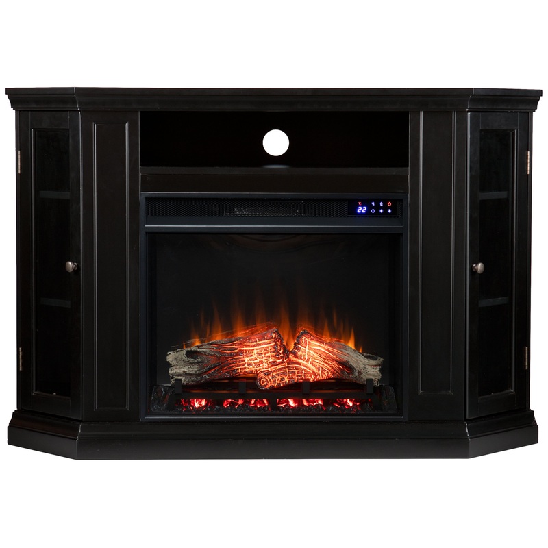 For entertainment enthusiasts, this ivory-finished fireplace tops the charts. Triangular media cabinets on either side of the firebox provide plenty of space for your favorite media selections, while the media shelf above offers convenient cord access. Realistic flames and embers keep your design feeling cozy all year long, with or without heat. For a traditional look with modern conveniences, add this fireplace curio to your living room or dining room look.
