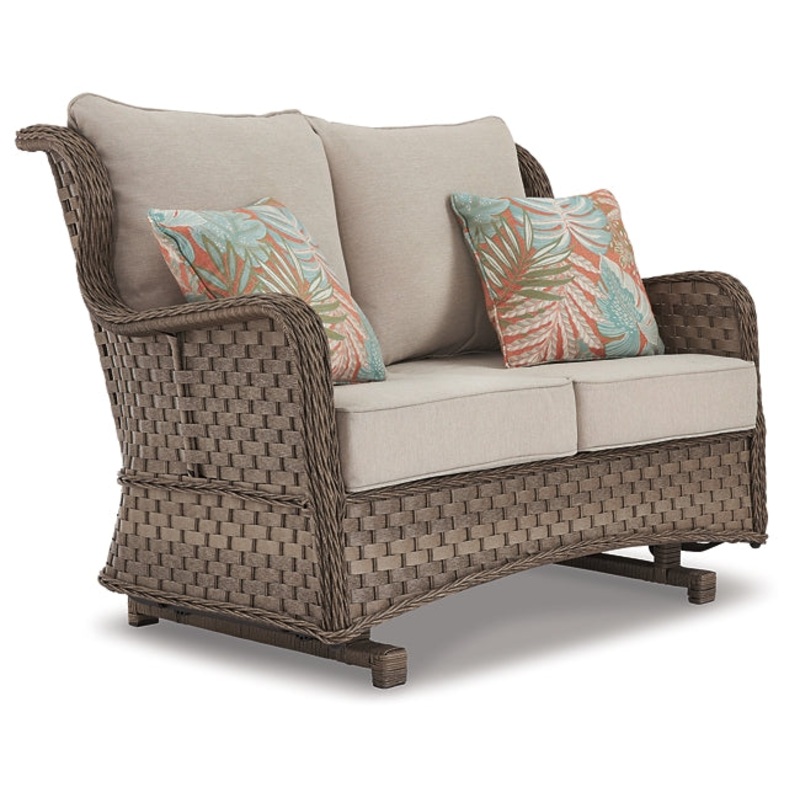 Clearly for those with exceptionally good taste, this outdoor loveseat glider revisits the past, but with todays low-maintenance approach in mind. Modeled after classic front porch wicker furniture, this high-style two-seater includes a rust-free aluminum frame beautified with an all-weather resin weave for authentic flairbut with easy care! Covered in high-performing Nuvella fabric, the loveseats plush cushions and throw pillows are sure to sit well with you, too.