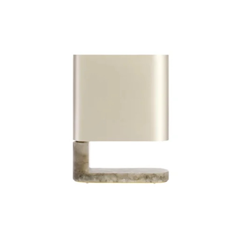 A truly unique light. Luxurious veined alabaster is hand cut and polished and is a thing of natural beauty and texture. Its curved form and translucent nature allows light to filter through adding a lightness that belies is obvious weight. Detailed with a brass plinth, a compact design for tables, consoles and desks.