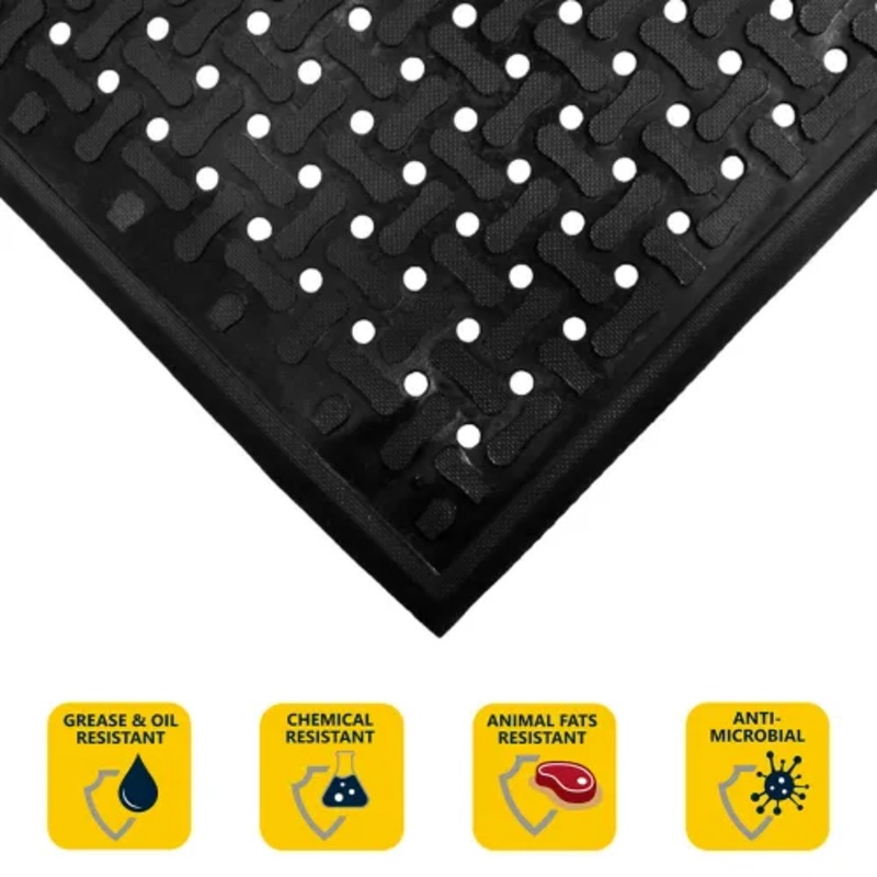 The light weight of this mat makes Comfort Flow easy to clean and handle. 100% high-density, closed-cell Nitrile cushion provides excellent anti-fatigue and anti-static properties. Anti-microbial treated to guard against odors and degradation. Beveled edges for safe access. Nitrile cushion is oil and grease proof. Welding safe. Perfect for food processing areas, machine shops and heavy industrial applications. Liquids and debris flow easily through holes. All comfort flow mats are certified slip resistant by the National Floor Safety Institute. Black finish. 3/8″ Thick. Approximately 60″L x 36″W overall.