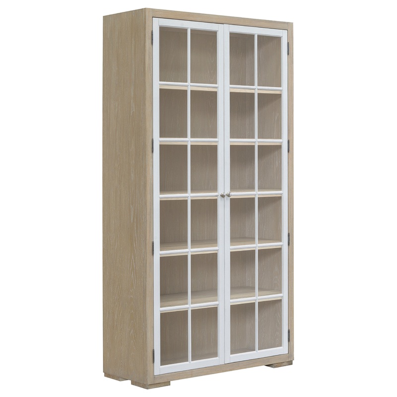 Chic and modern, our Two-Toned Door Bookcase blends natural warmth with streamlined elegance. The main structure is finished in a light, natural wood tone, showcasing the beauty of the wood grain and adding an organic appeal. Glass doors with window panel fronts in a white finish offer the perfect contrast with a light wood finish on the case. Five interior wood shelves, block feet, and satin nickel hardware complete the overall design, making this bookcase an attractive and practical addition to any home.
