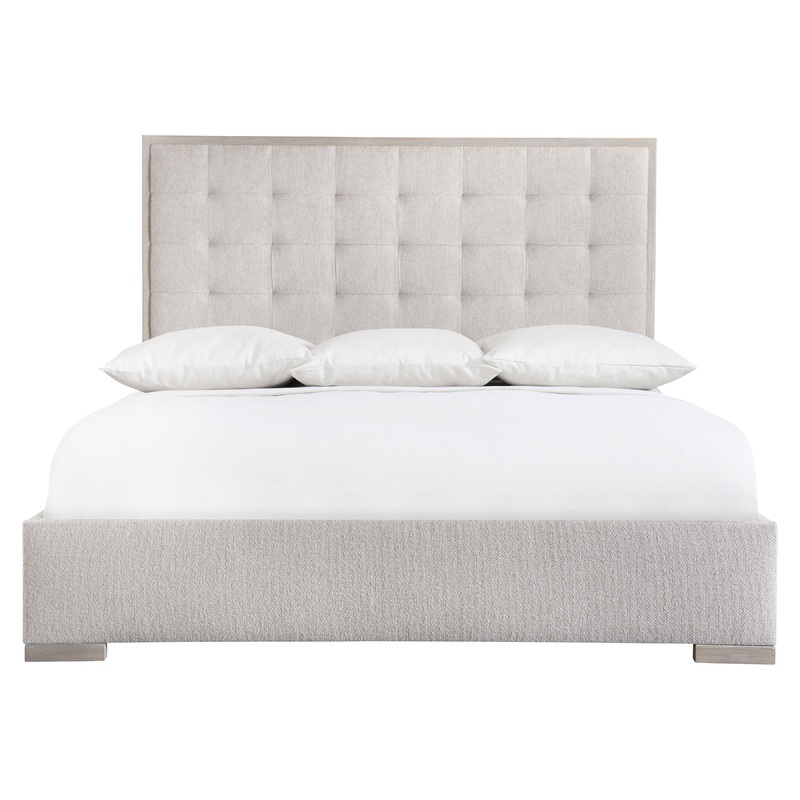 An upholstered headboard panel on the Cornelia bed adds a modern style to a traditional design with buttonless tufting. Upholstered side panels and footboard add texture that perfectly complements the wood frame and feet in Nebbia finish.