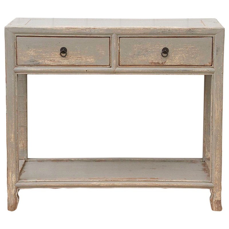 A charming reproduction Chinese painted console table with two drawers and a lower shelf. This shabby chic console has clean modern lines with an artisanal distressed light gray finish. This Asian Ming style entry table is made from reclaimed wood with bro