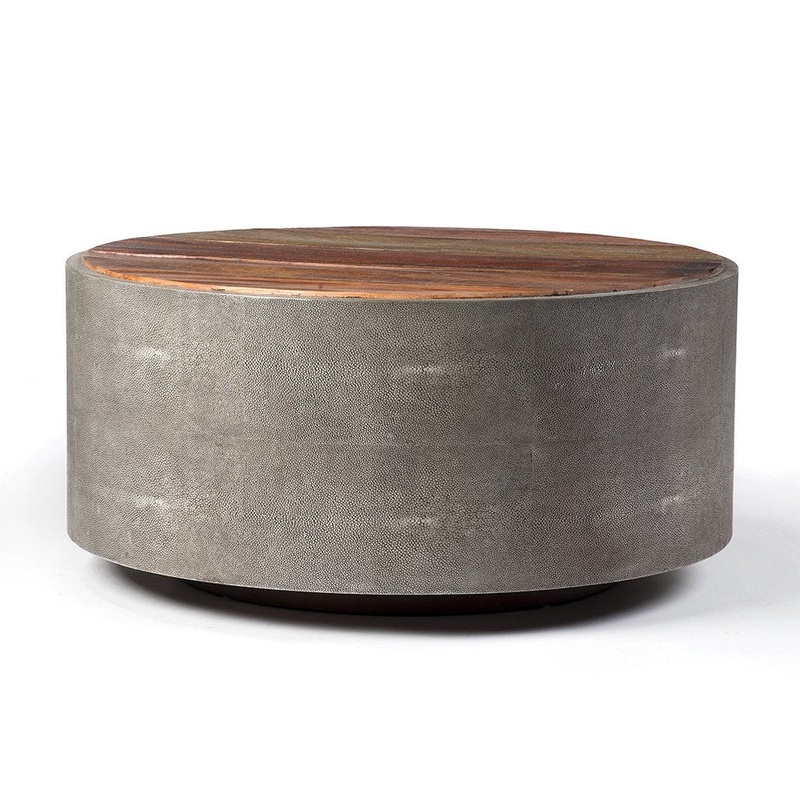 Mixed materials and the simplest of shapes offer a dramatic centerpiece for any space. Reclaimed Peroba wood is supported by a textural faux shagreen base in soft grey.