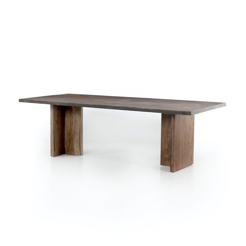 Iron strapping with a brushed gold finish adds a rustic, industrial edge to a substantial plank table. Beautiful graining marks simple, cross-shaped trestles and table top.