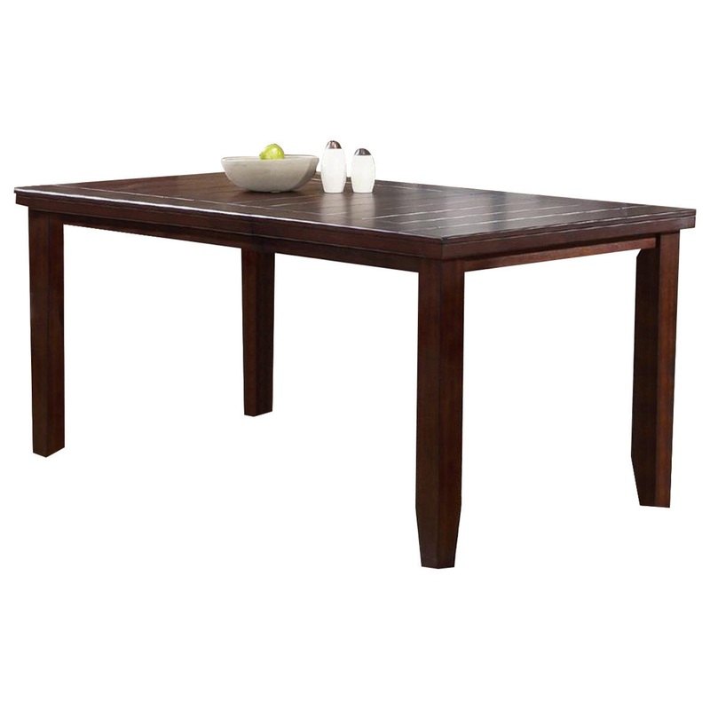 A plank top adds rustic style to this contemporary style counter height table that is sophisticated enough for guests or daily use with your family. The rectangular table extends from 60 inches in length to 78 inches long with 18-inch leaf. The versatile leaf adds flexibility for hosting friends and family. Slightly tapered block feet complete the tables style.