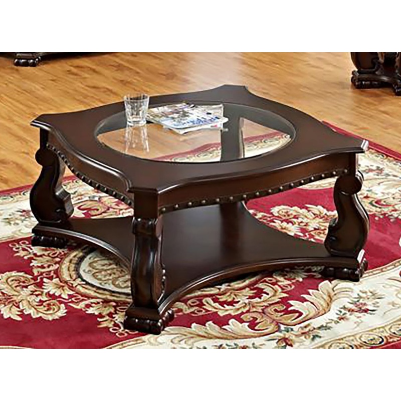 Crown Mark Furniture Madison Wood Coffee Table in Brown 4320-04. A fantastically elegant living room centerpiece for your home, this glass top cocktail table features a lower display shelf for accessories or books, as well as great woodworking accents. This sweeping stately design completes a decadent table. Pair it with the coordinating sofa and end table to complete a lush design for the living room in your home.