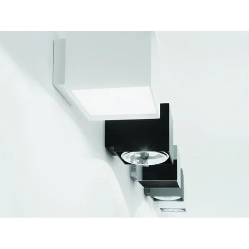 Cubo is a ceiling and wall family of lamps and has been realized to fulfill essential lighting design needs with orientable QR111 LED and halogen or for a diffused light with a LED board and metacrylate opal screen. Double emission G9 version available for the wall version. Realized in black. Power transformer and drivers integrated in the lamp body.
