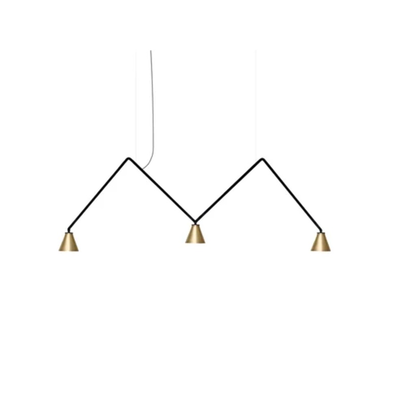 The Dabliu Cone Suspension Lamp showcases a refined balance of materials and geometry, with its black aluminum framework supporting three conical diffusers in a burnished gold finish. This luxurious combination enhances the lamp’s visual appeal, offering a warm, inviting glow suitable for dining rooms, lounges, or contemporary living spaces. The slender and extended dimensions of the lamp allow it to serve as a centerpiece over tables or bar areas, effectively combining form and function. Available in black and gold tones, it seamlessly integrates into diverse interior styles, from modern to eclectic.