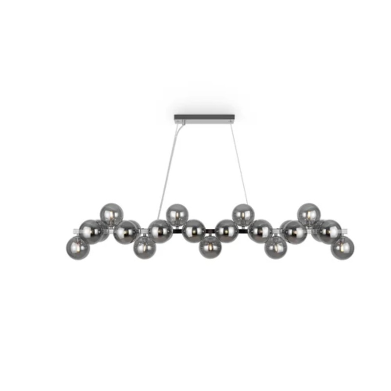 With its innovative design and refined style, this lamp immediately attracts attention and stands out as a piece of art in the field of lighting. The long horizontal metal structure, blends harmoniously with the refined spherical lampshades made of either amber or white glass in the gold version or alternatively smoked in the chrome or black versions, allowing this pendant to become the focal point of any interior, offering an enveloping and warm illumination in rooms. Ideal in a dining room, living room or commercial establishment, Dallas with its presence gives any space a touch of class by creating a unique and refined atmosphere.